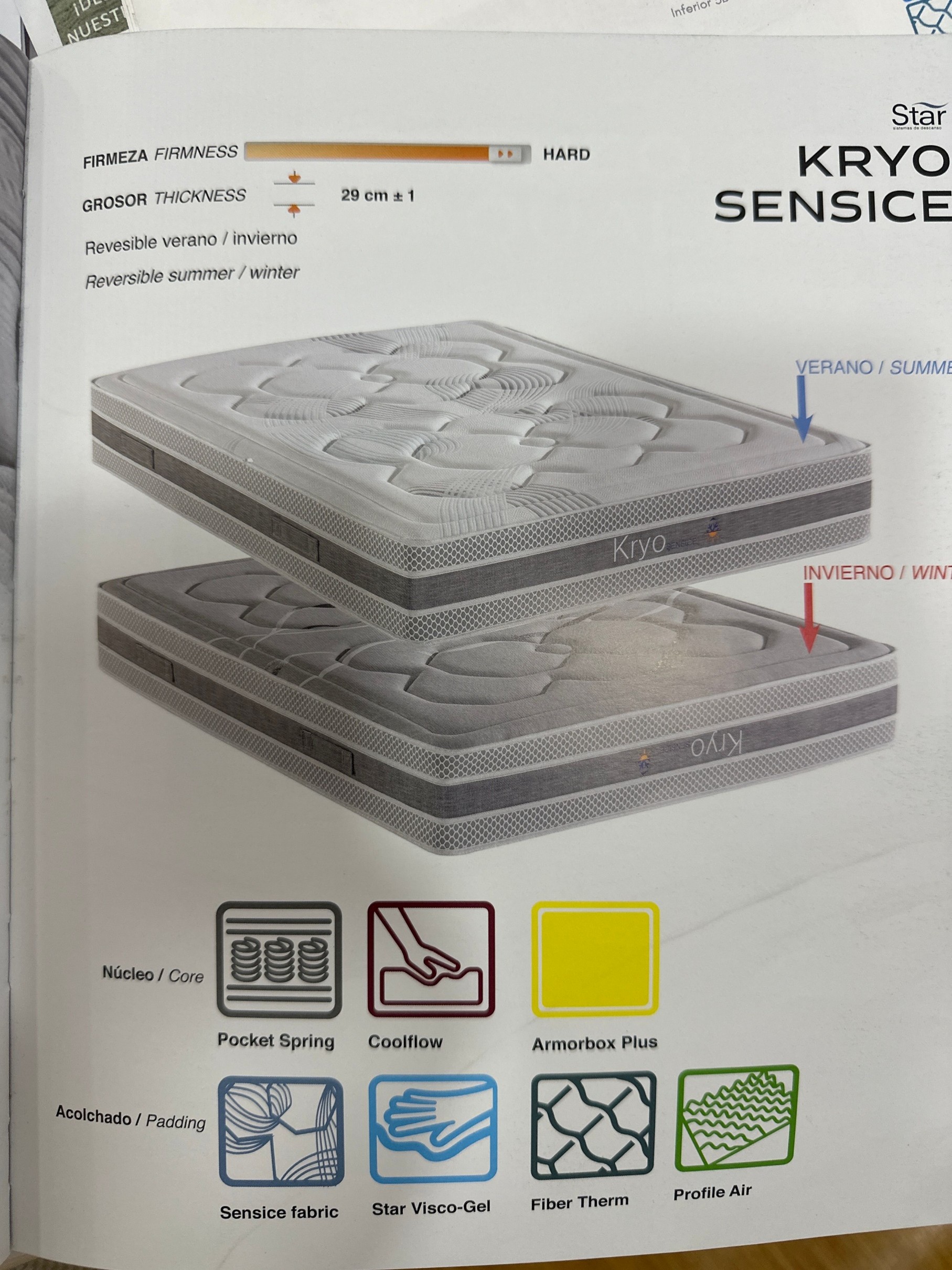 Con dos caras una fría con un tejido Micro partículas que proporciona una frescura permanente y la otra cálida y agradable. Muelles ensacados con refuerzo perímetral armorbox plus que le da estabilidad y firmeza.